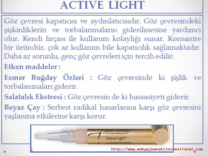 | | JANE IREDALE | | ACTIVE LIGHT KENDİ ÖZEL FIRÇASI İLE KULLANIMI KOLAY VE PRATİKTİR. |