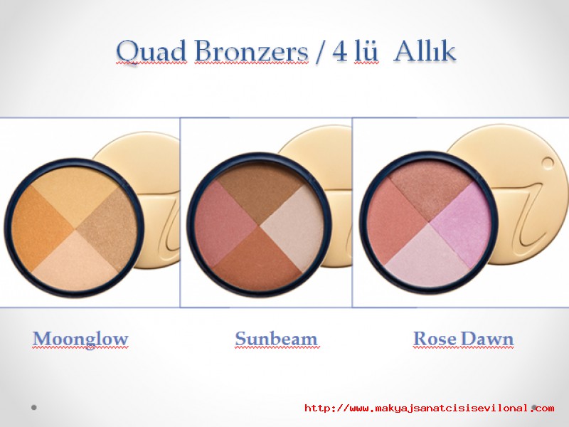 | | JANE IREDALE | | QUAD BRONZERSLARI İSTER ALLIK, İSTER BRONZLAŞTIRICI, İSTER AYDINLATICI OLARAK KULLANABİLİRSİNİZ. MOONGLOW & SUNBEAM & ROSE DAWN . HATTA FAR OLARAK YARATICILIĞINIZI KULLANABİLİRSİNİZ. |