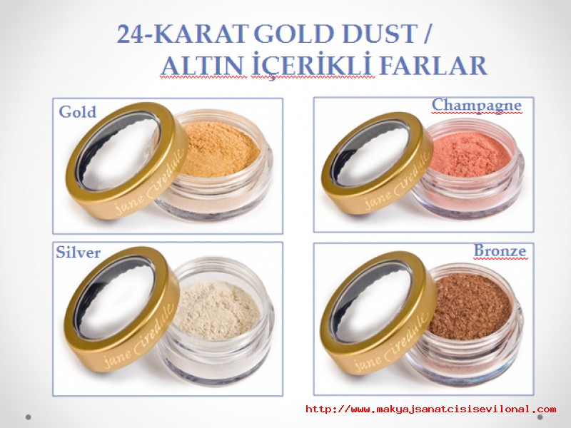 | | | JANE IREDALE | | 24 KARAT ALTIN İÇERİKLİ FARLARIMIZI MUTLAKA DENEMELİSİNİZ. GOLD & CHAMPAGNE &SILVER& BRONZE |
