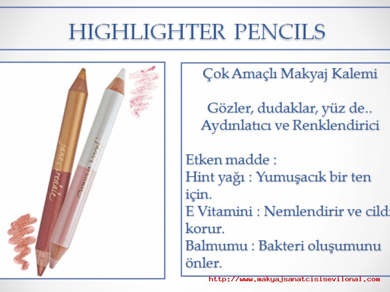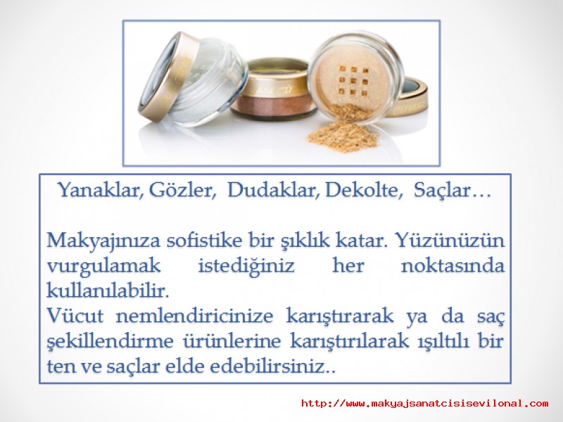 | | JANE IREDALE | | YANAKLAR, GÖZLER, DUDAKLAR, DEKOLTELER, SAÇLAR .... YARATICILIĞINIZ SİZE KALMIŞ. ÇOK AMAÇLI KULLANBİLECEĞİNİZ IŞIL IŞIL SANAT ESERLERİNİ YARATMAYA NE DERSİNİZ? |