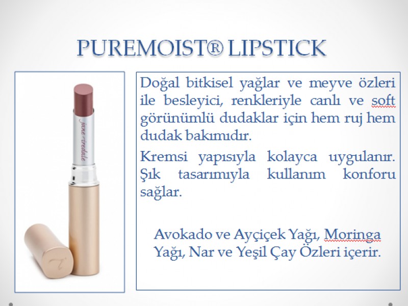 | | | JANE IREDALE | | PUREMOIST LIPSTICK / FARKLI RENK SEÇENELERİ BULUNMAKTADIR. |